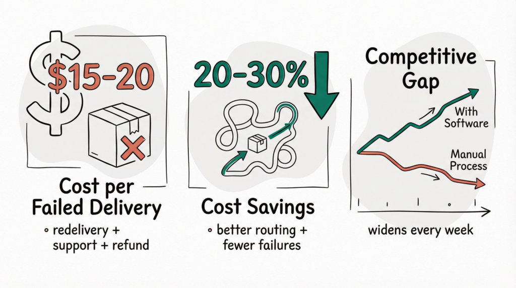 - A single failed delivery costs $15-20 in redelivery, support time, and potential refund