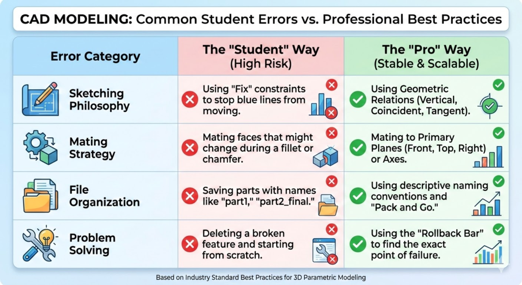 For example, if you tell the software that Part A must be 50mm from Part B, but also that Part A must be centered on a hole that is only 40mm away, the software “breaks.” Undergraduates often spend hours chasing these errors without realizing that the problem started three steps ago in a simple sketch.